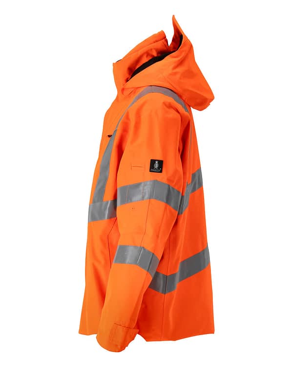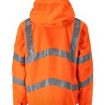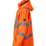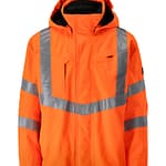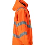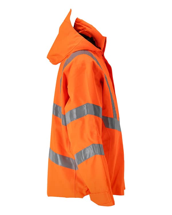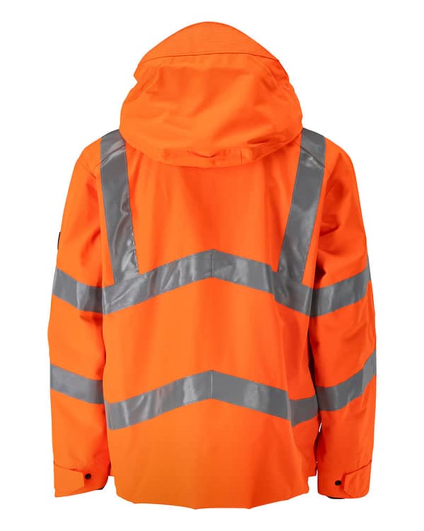 Fluorescerande med lodräta och sneda tvärgående reflexer. Andasfunktion, vind- och vattentät. Sömmarna är tejpade. Fodrad i nätmaterial. Huvan är löstagbar, fodrad och har justerbart elastiskt snöre så att den kan passa utanpå en hjälm. Reglerbar metalltråd i båda sidorna av huvan. Nät med ventilation under ärmarna – öppnas med blixtlås. Hög krage. Innerkrage av resår. Vattentät pennficka på ärmen. Stängning med blixtlås och vindskydd med tryckknappar. Innerfickor med blixtlås under vindflik – den ena är särskilt utformad för telefoner, med hål till kabel och headset och öglor för att hålla kabeln på plats. Ficka med blixtlås under vindflik med plats för en 7-tums surfplatta. Extra tyg nederst på ryggen kan vikas ned med knappar och ge extra längd baktill och därmed extra skydd mot väder och vind. Bröstficka med blixtlås. D-ring. Ergonomiskt utformade ärmar ger god rörelsefrihet. Ribbvirkat vid handleden sluter åt bra och håller ute kylan. Manschetter med CORDURA®-förstärkning och knappknäppning. Framfickor med blixtlås.
