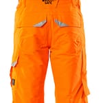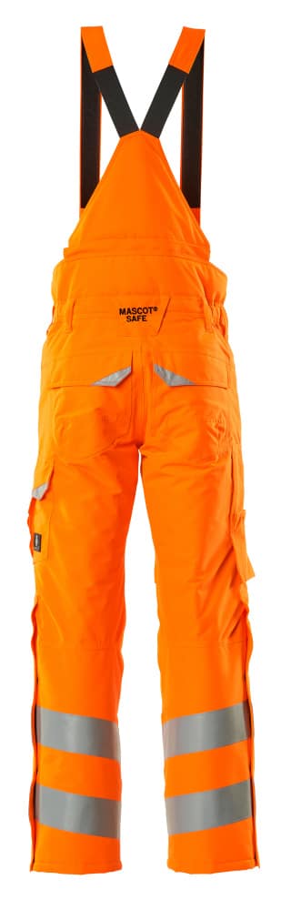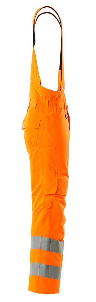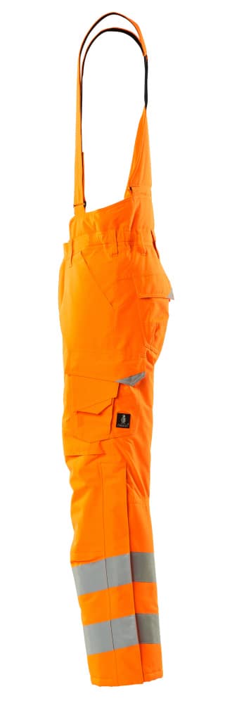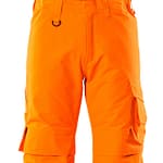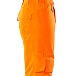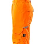 Fluorescerande med sneda tvärgående reflexer. Andasfunktion, vind- och vattentät. Sömmarna är tejpade. Quiltfoder. Bältesstroppar. D-ring. Gylf med blixtlås. Fickor på framstycket. Bakfickor med förstärkningar, lock och dolda tryckknappar. Benficka med förstärkningar och extra fickor – en invändig telefonficka samt en utvändig telefonficka med lock och magnetknäppning. Tumstocksficka. Knäfickorna är justerbara och har lock öppning upptill. Snölås invändigt i benen. Blixtlås med vindskydd på yttersidan av benen. Vi rekommenderar 00418-100, 00718-100, 50451-916 och 20118-915 knäskydd till den här modellen. Samcertifierade med knäskyddstyp SHORT eller LONG enligt EN 14404.